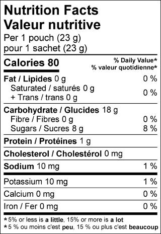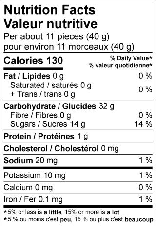 Sucres (purée de fruits entiers [raisin, pêche, orange, fraise, framboise], sirop de maïs, sucre), Amidon de maïs modifié, Gélatine, Acide citrique (acidulant), Citrate de sodium, Arômes naturels, Cire de carnauba, Colorants naturels (rocou, curcuma, anthocyanines, concentrée de jus de carotte, concentré de jus de bleuets).