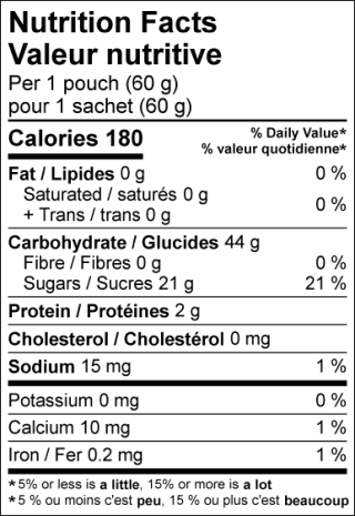 Sugars (whole fruit puree [grape, peach, strawberry, raspberry, blackberry, blueberry, cherry], corn syrup, sugar), Modified corn starch, Gelatin, Citric acid (acidulant), Natural flavours, Carnauba wax, Natural colours (turmeric, annatto, anthocyanins, carrot juice concentrate, blueberry juice concentrate, watermelon juice concentrate, huito juice concentrate).