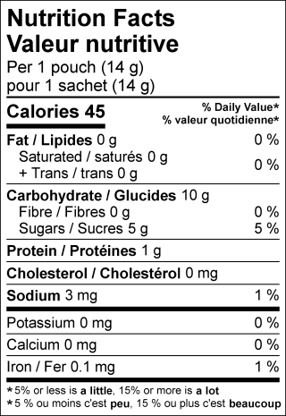 Sugars (whole fruit puree [grape, peach, orange, strawberry, raspberry], corn syrup, sugar, grape juice concentrate), Modified corn starch, Gelatin, Citric acid (acidulant), Natural flavours, Carnauba wax, Natural colours (turmeric, annatto, anthocyanins, carrot juice concentrate, blueberry juice concentrate).