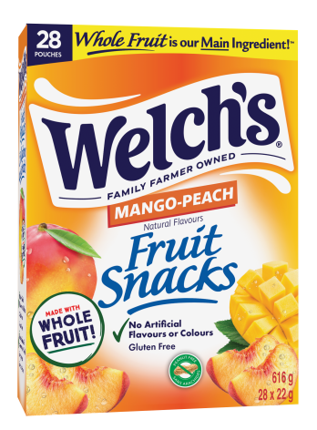Made with Whole fruit as the Main Ingredient, Welch’s® Fruit Snacks are Canada’s Favorite Fruit Snacks®! Now Now available in mouthwatering Mango-Peach, these fruit snacks are Fat Free, Gluten Free and contain No Artificial Flavours or Colours! Perfect for the whole family and a fan favorite, Welch’s® Fruit Snacks Mango-Peach never disappoints!