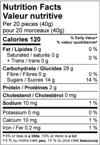 Whole fruit puree (grape, mango, peach), corn syrup, sugar, modified corn starch, gelatin, citric acid (acidulant), lactic acid, natural flavors, ascorbic acid (vitamin c), alpha tocopherol acetate (vitamin e), vitamin a palmitate, carnauba wax, annatto (color), and turmeric (color)